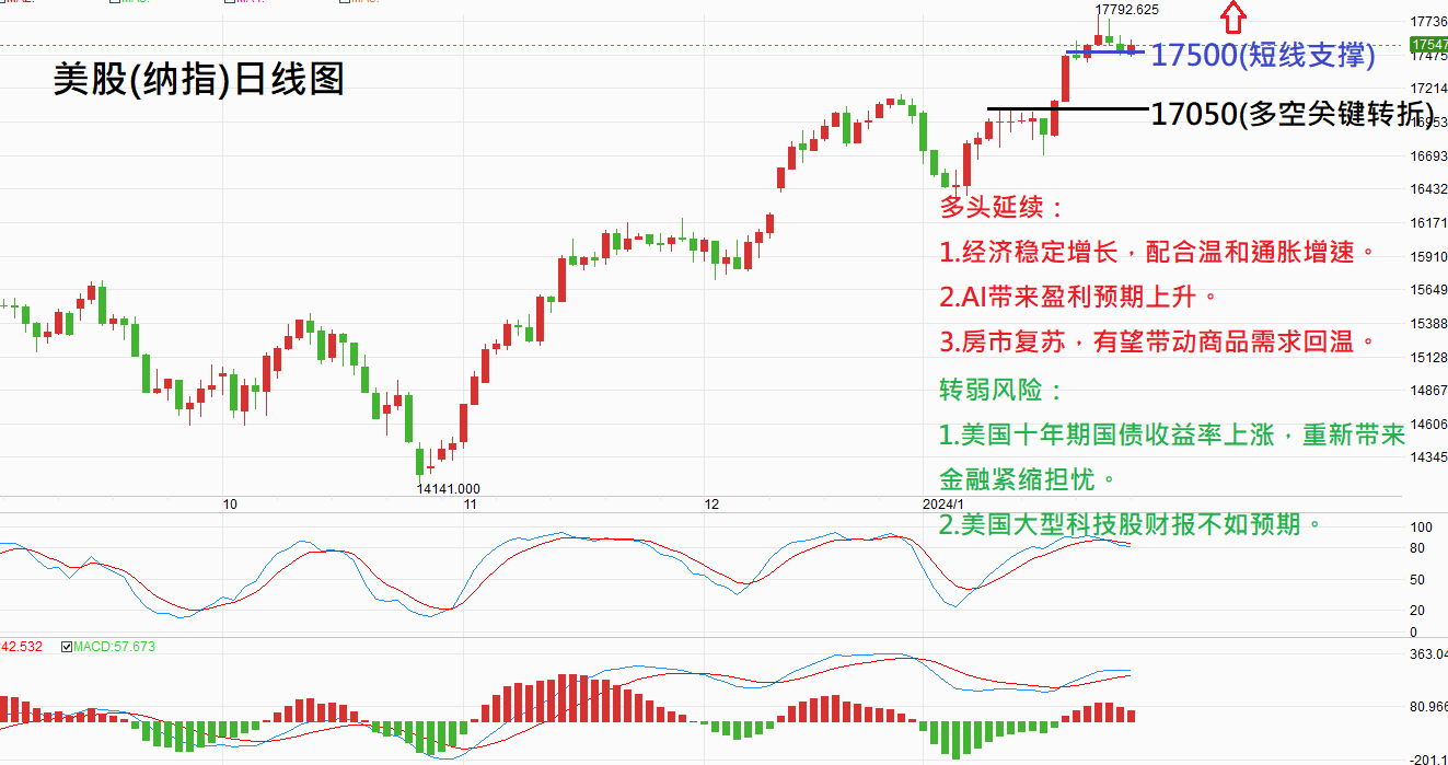 综合宏观经济分析,美国经济呈现稳定增长,通胀保持在温和增速。人工智能AI带来的盈利率预期上升对市场有积极作用,但需关注市场对利率预期调整可能带来的压力。房市的复苏有望带动商品需求回温,为美股延续涨势创造有利条件。技术面上,纳指若能站稳17500点以上,多方动能或将推动股指创下新高。然而,仍需关注大型科技公司财报以及十年期国债收益率的走势,上涨可能带来金融紧缩的担忧。