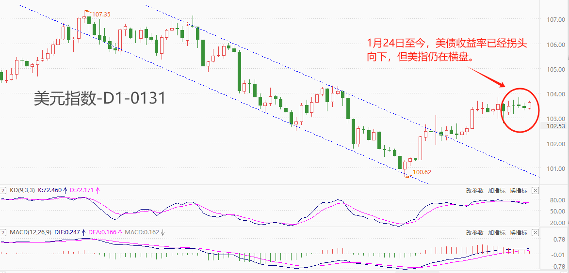 技术角度看,美元指数处于中长期下跌趋势的反弹阶段,反弹波段整体呈现出横向波动特征。1月24日开始,美债收益率已经拐头向下,但美元指数仍在横盘震荡,没有出现明显下跌。传统逻辑认为,债券收益率是美指变动的根本动力,美元指数的后市发展承压下行概率较高。震荡指标KD的读数处于相对高位,快慢线交叉缠绕,短期可能延续震荡格局。MACD指标的柱线处于零轴上方,但绝对值较低,多头动能不足。综合来看,多数指标认为美元指数短期将延续横向波动,中期可能跟随国债收益率回落。