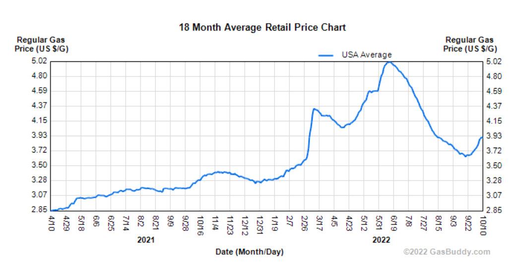 回顾8月油价均价约落在91.5元,而近期短短几个交易日原油出现强力上涨又回到90元大关之上,短期如果油价居高不下,通胀要由高档回落时间势必加长。近期高盛报告油价上看110美元,Bloomberg经济学家也预估100美元,那等同于油价回到今年6、7月高位,当时CPI分别为9%、8.48%,也就是通胀初始下滑之顶,当然在其他细项因为需求溃堤导致价格下降,供应链好转,实际通胀状况并不会到达这样高位,预设最差情境将这样惨况比拟给读者参考。再者,不少消费信心数据回升起因于汽油价格下落,目前这样预期也从金融市场燃烧至实体经济上,由GasBuddy美国汽油18周零售价格拐头向上至3.93美元/加仑,未来各项消费数据上势必受到排挤。