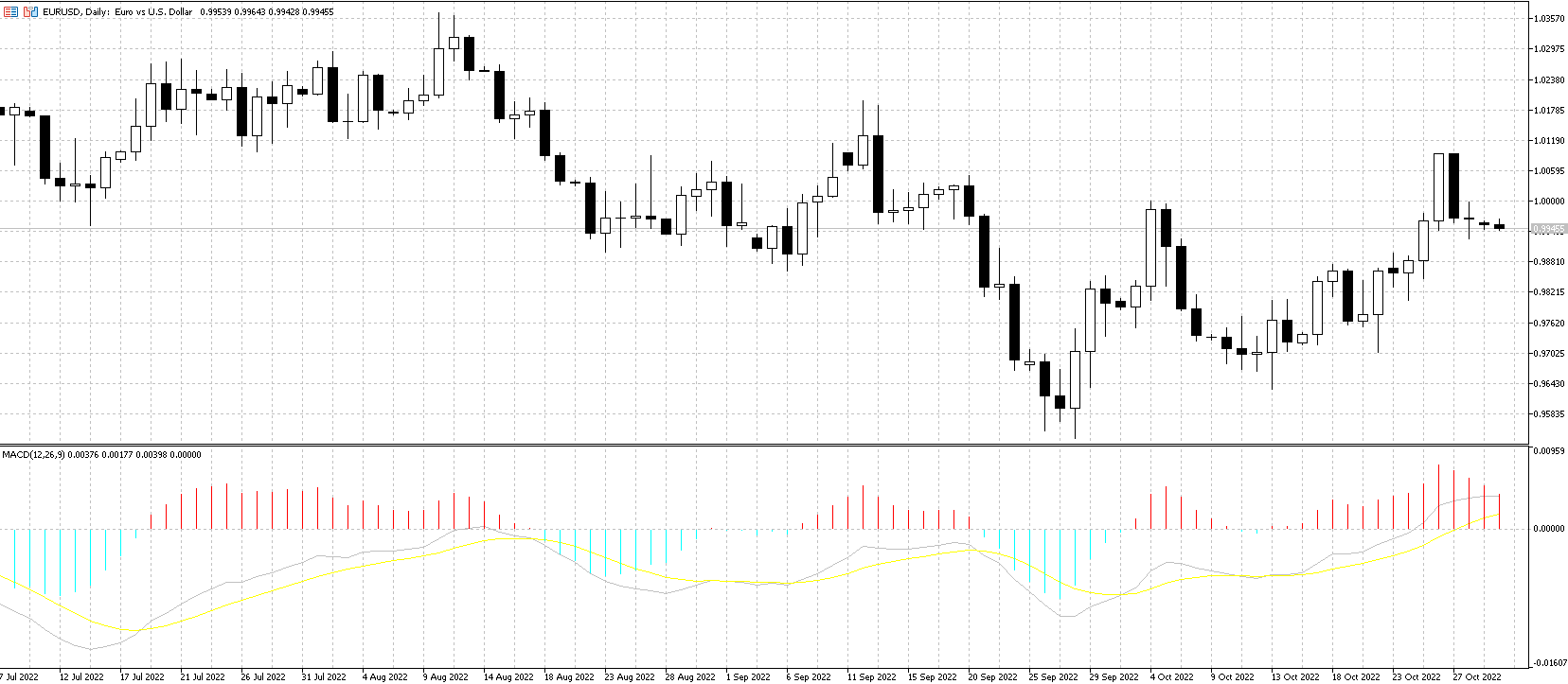 欧元兑美元隔夜汇价延续跌势,小幅下挫,收阴十字星,收盘0.99655;日线图上,MACD双线0轴线上方运行,快线走平,阳柱势能小幅缩量。