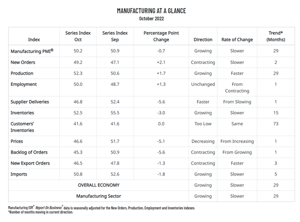 昨晚每个月1号,美国供应管理协会(ISM)公布其采样约400间公司的主管,描述其产业状况的PMI,本月是下降了0.7到了50.2,已十分接近荣枯值,而市场并没有如先前因为市场逐渐冷却(可能会导致通膨下降的状况)而大涨,反倒是一路下挫,虽然不至于大跌的状况,但也显示市场逐渐理性化思考,因「坏消息」发生而下跌,对于这信心缺乏的市场而言,这何尝不是一个「好消息」呢?而本次PMI透漏出什么消息呢?