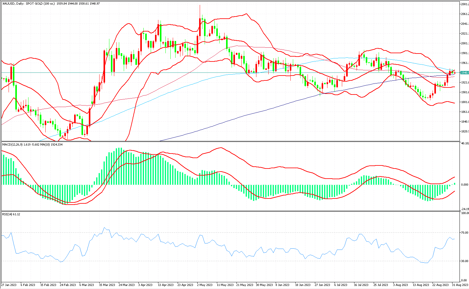 黄金日线图上看,MACD双线抬头运行,阳柱势能凸现,布林带开口轻微向上扩大,金价当前在1941位置震荡,技术面看金价当前处于震荡区间,趋势小幅趋多。日内看阻力位在1955位置附近,然后是1970位置左右;下方第一支撑位在1925位置,然后是1912布林带中轨位置。