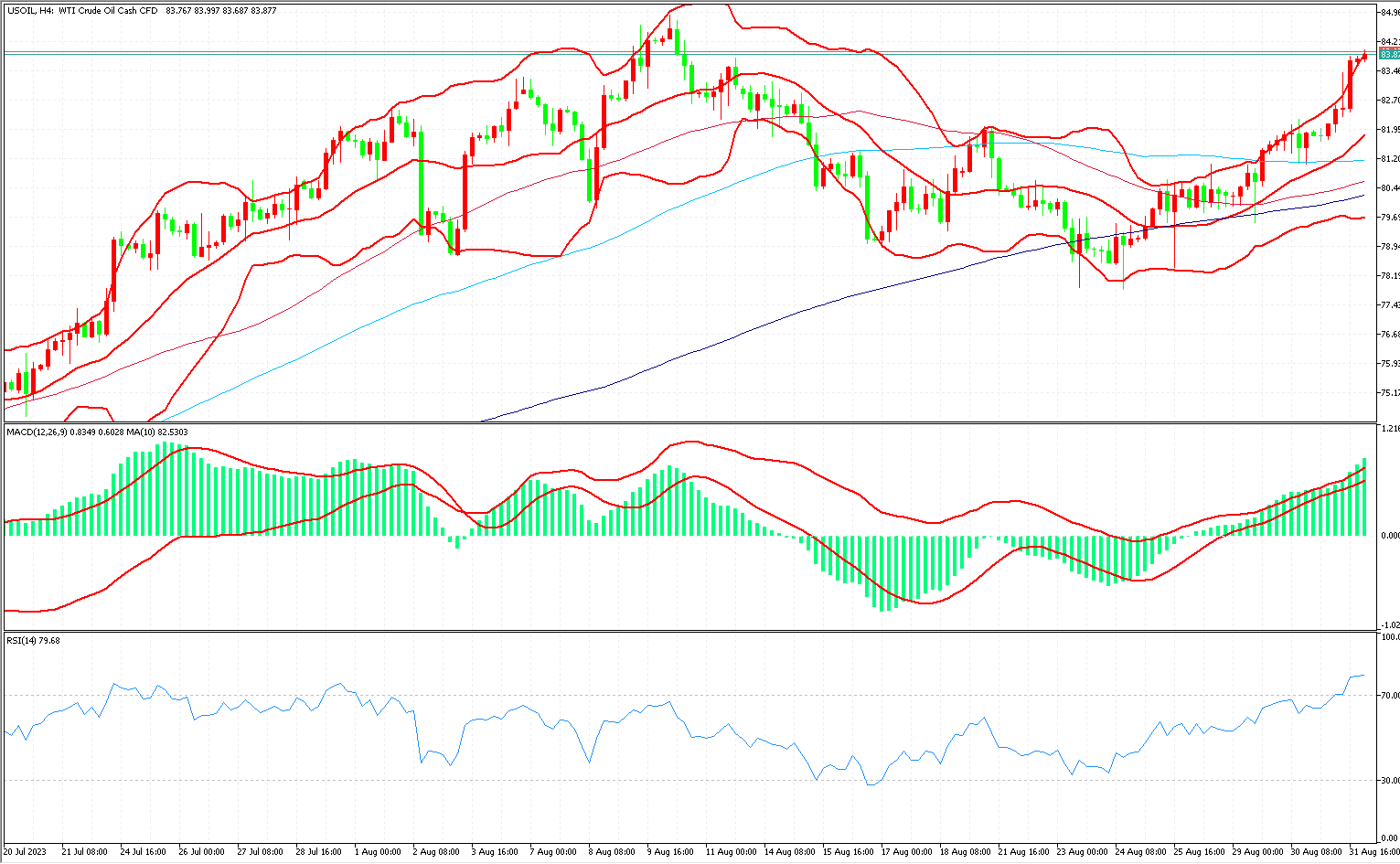原油4小时图上看,MACD双线在零轴上方向上运行,阳柱势能持续放量,布林带开口向上扩大,油价当前在84位置附近波动。技术面看短线油价偏向震荡区间,趋势趋多,日内看支撑位在83点位附近,然后是82位置;阻力位在85关口位置,然后是86位置。
