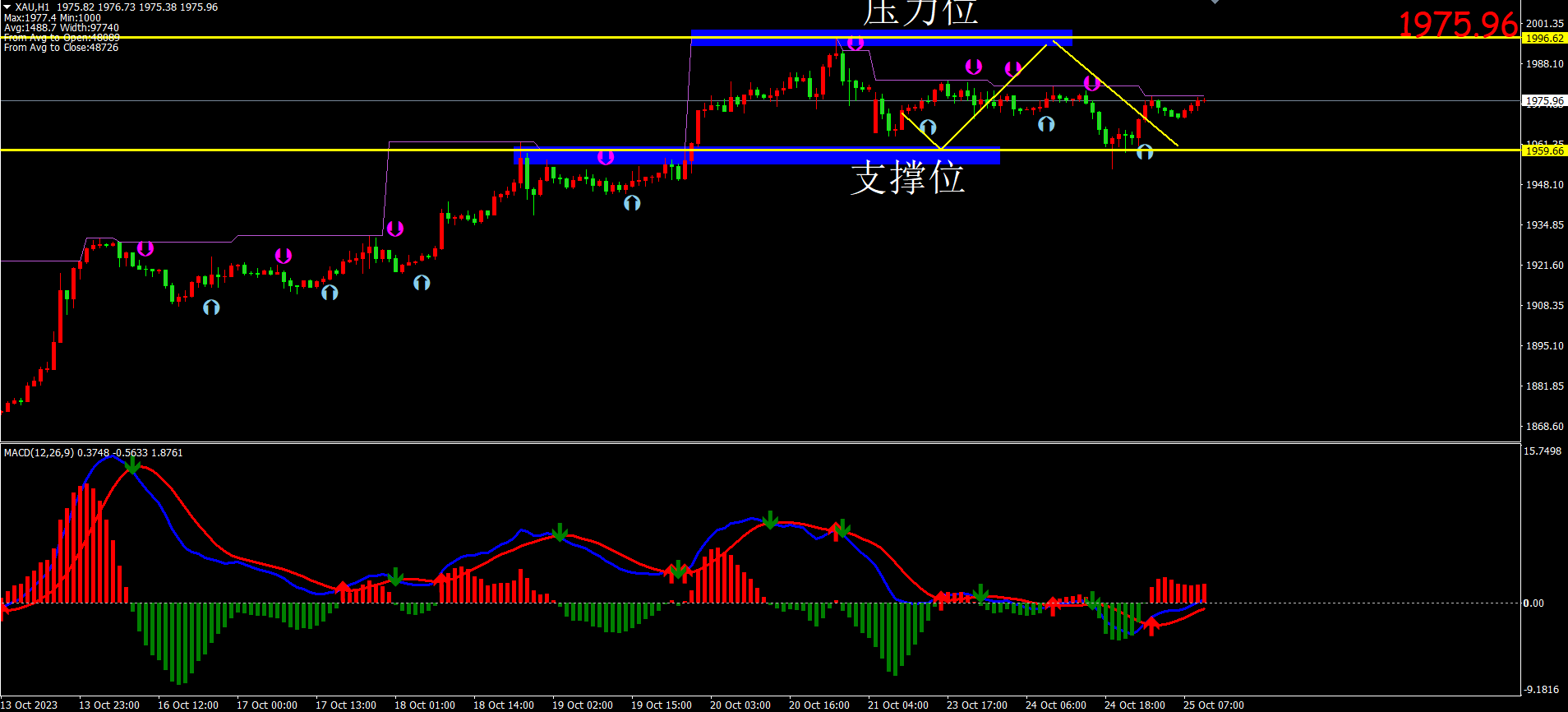 1. 黄金技术指标avg显示目前K线在下轨附近运行,小时图周期为行情价格盘整,下方支撑1960.0附近(下轨),上方压力1996附近。