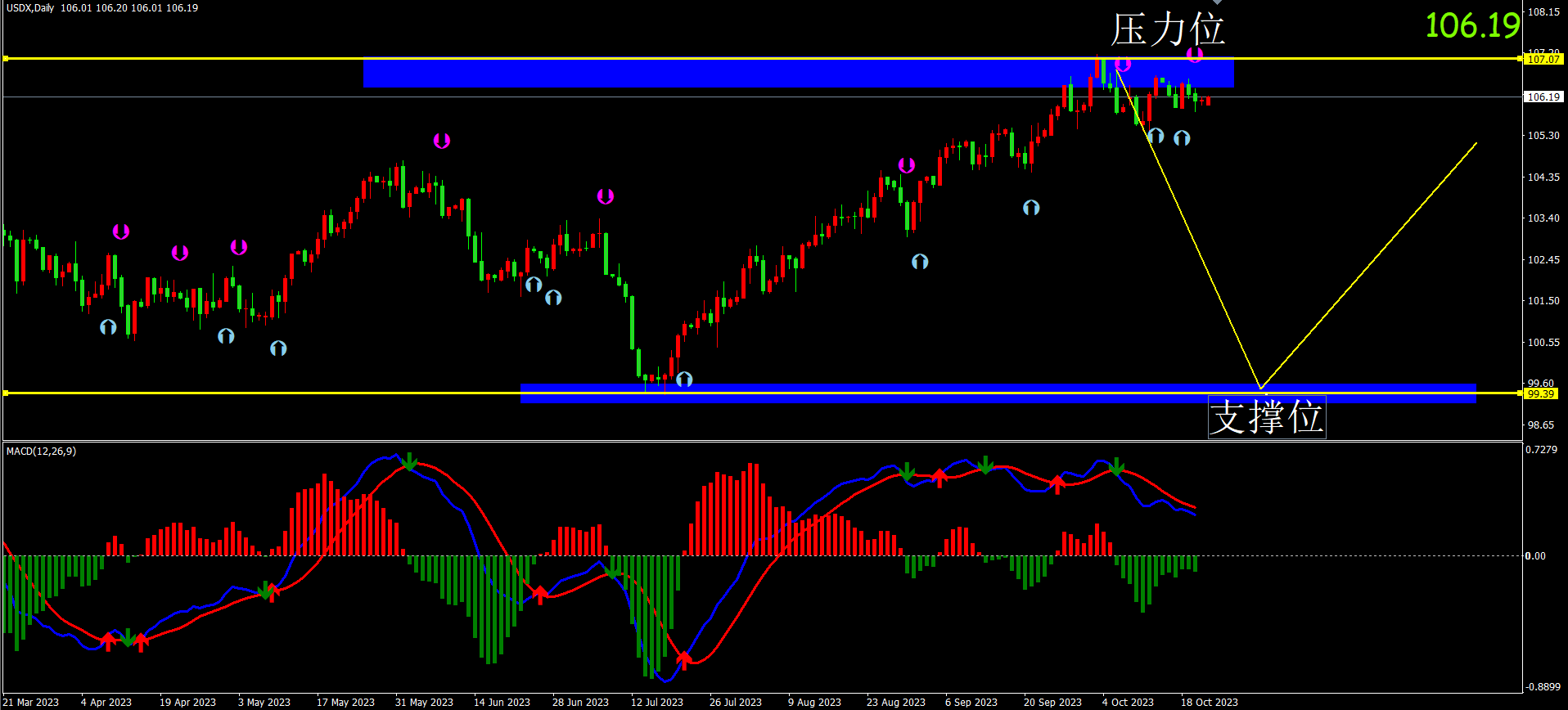 美元指数:图表显示目前美指为震荡反弹行情。关注压力107.00位置。